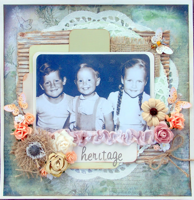 For this layout I applied Gesso all over my background cardstock to dull it down a little to give more of a vintage feel. I also misted the background with some tattered angels mists.