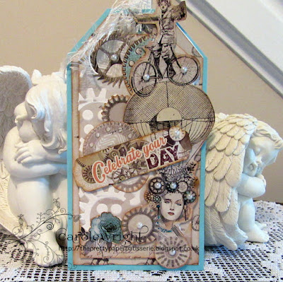 - Take the cogs stencil and texture paste, stencil onto the back of the Fantasy 12 x 12 paper C100 003, allow to dry then cut into a tag shape 7.5 x 3.75 inches, ink edges, adhere
